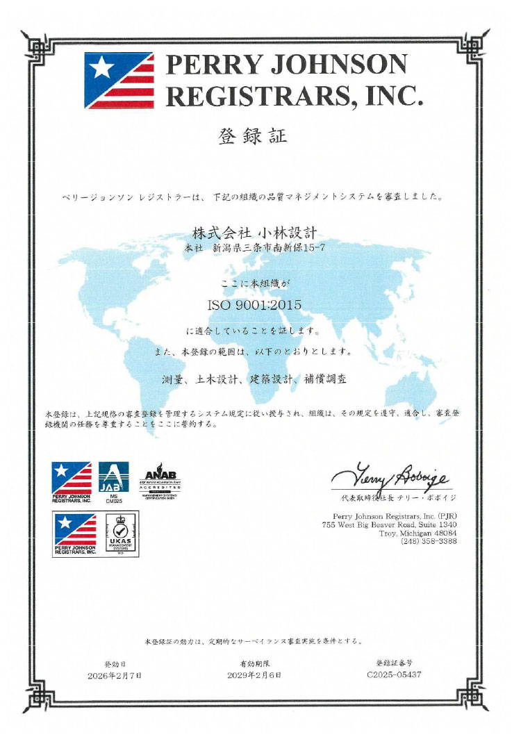 | 加入団体 | (一社)日本測量協会 (一社)日本補償コンサルタント協会 (一社)新潟県測量設計業協会 (一社)新潟県農業土木技術協会 (一社)新潟県建築士事務所協会 新潟県建築設計協同組合 |